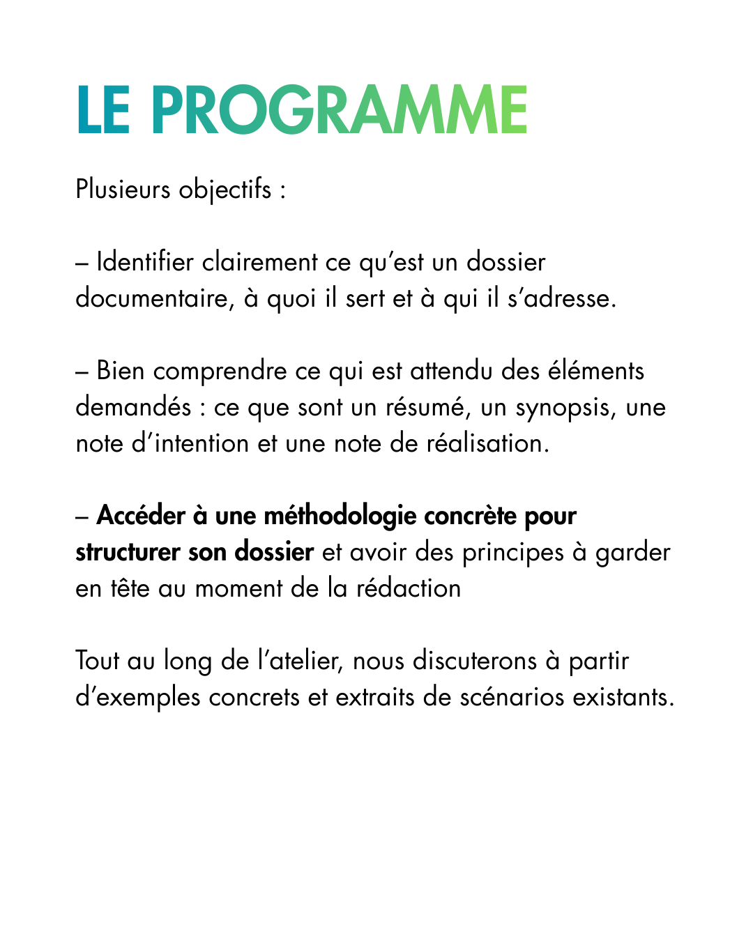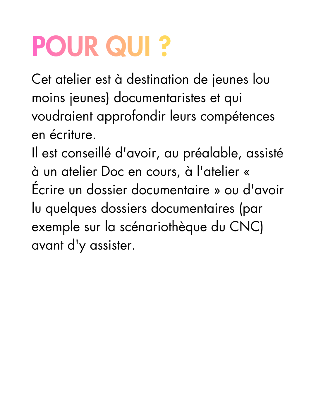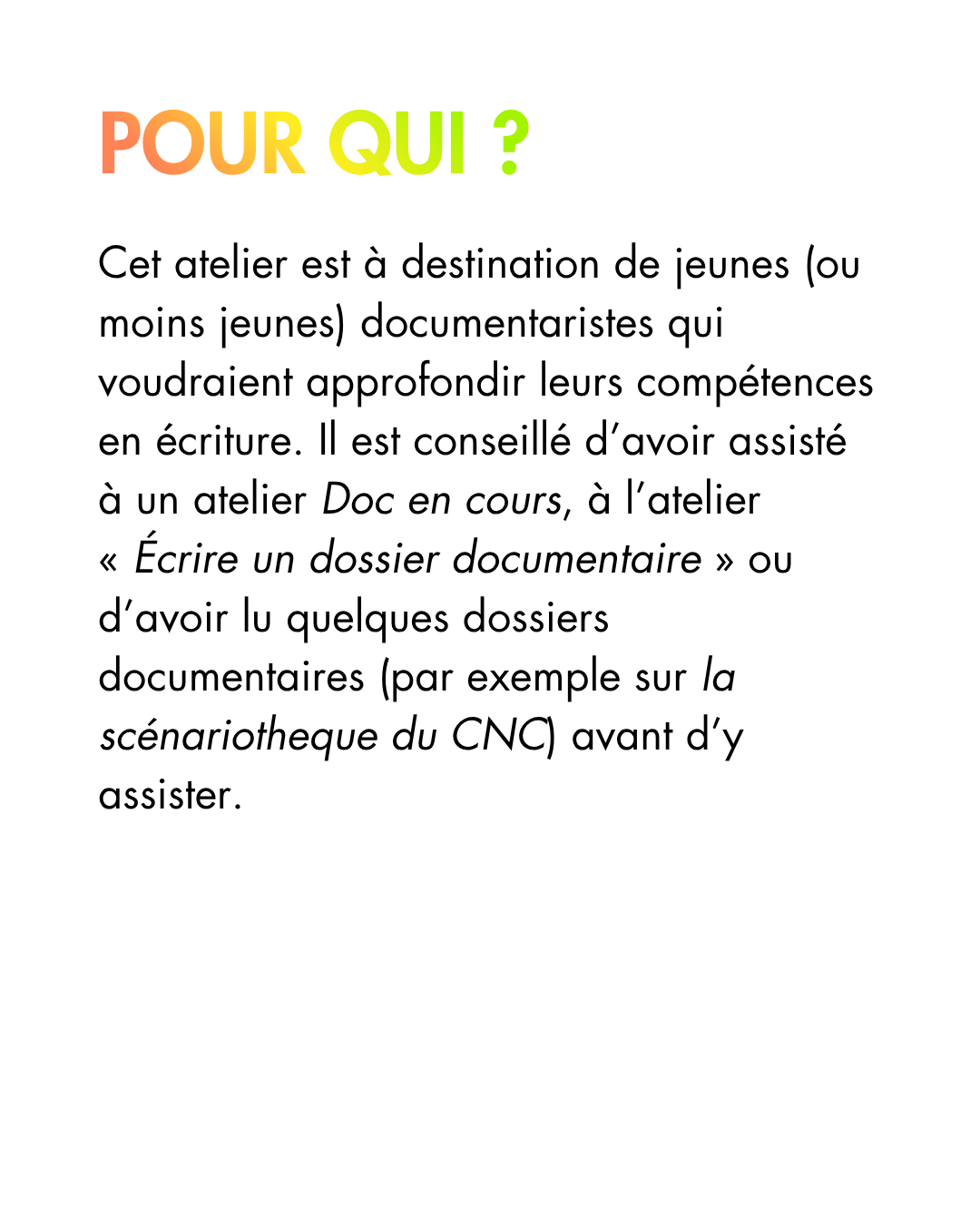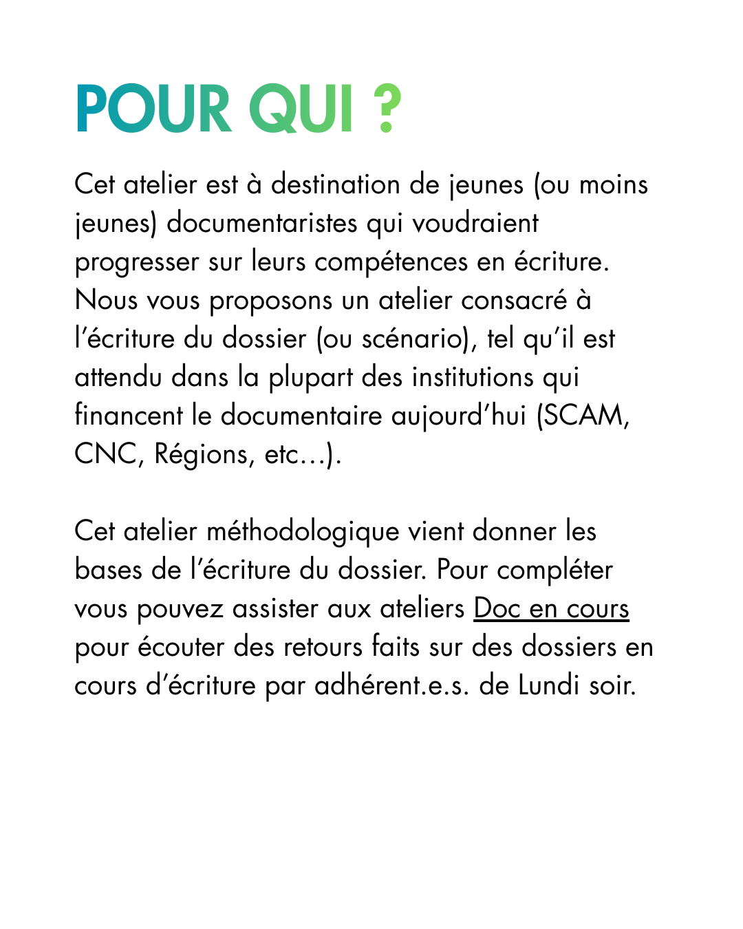 Des formations sur différents sujets en lien avec le documentaire, animés et proposés par les adhérent·es de l’association. Le programme de ces ateliers dépend des demandes et des propositions des membres de l’association.