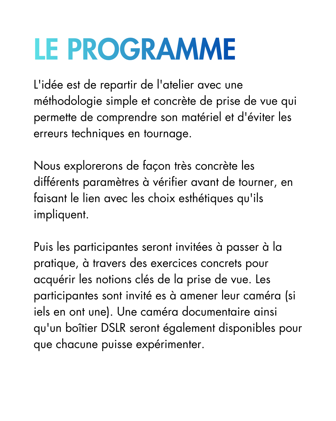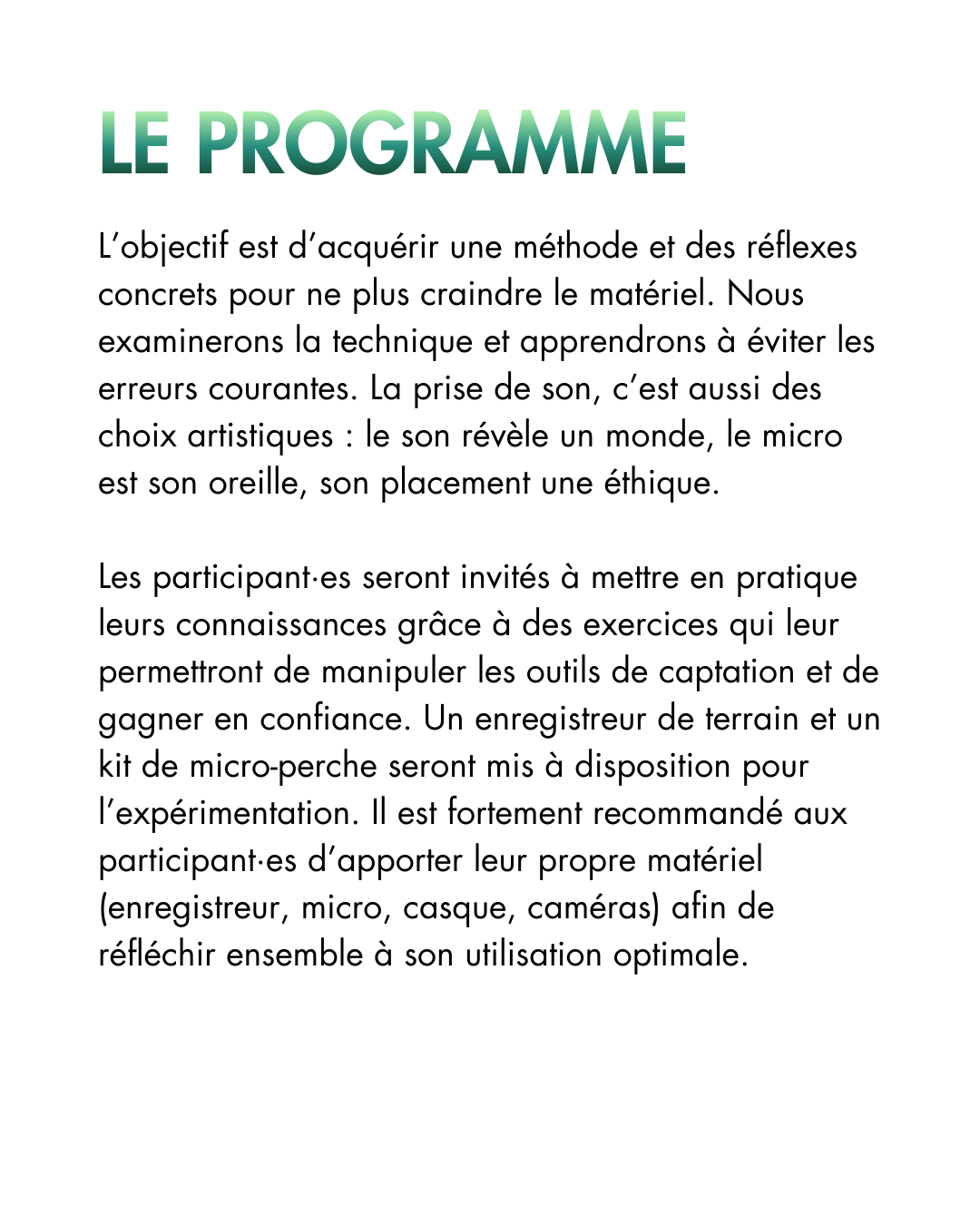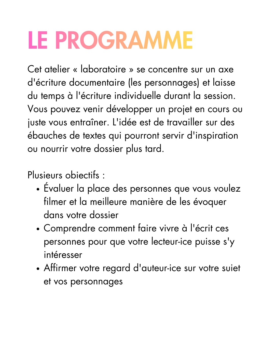 Des formations sur différents sujets en lien avec le documentaire, animés et proposés par les adhérent·es de l’association. Le programme de ces ateliers dépend des demandes et des propositions des membres de l’association.