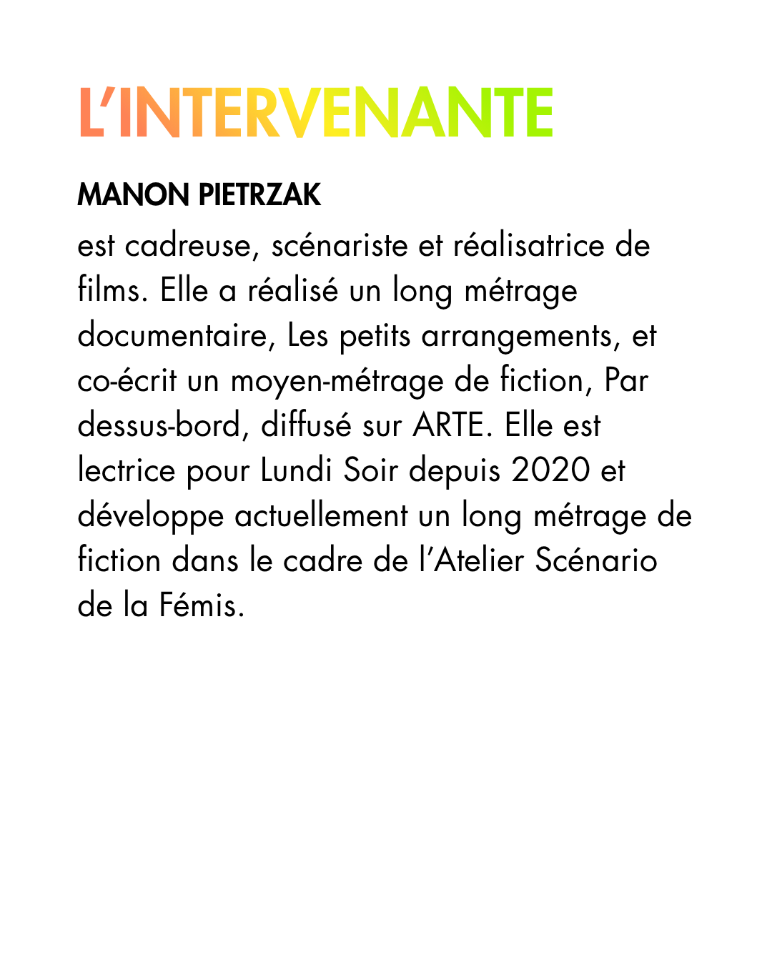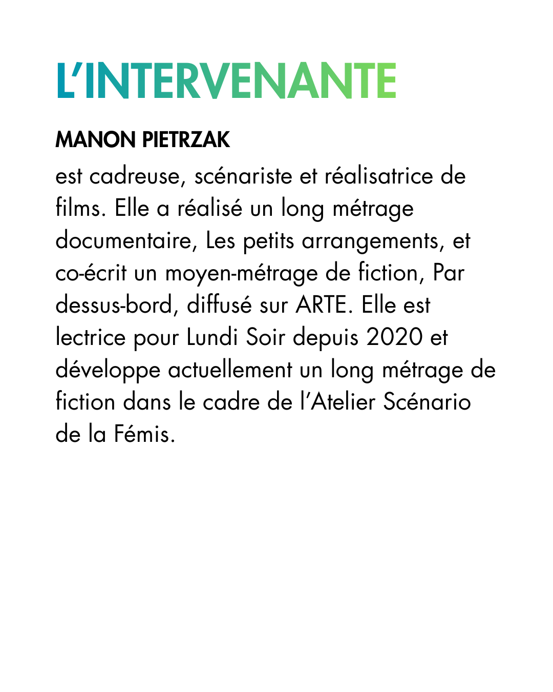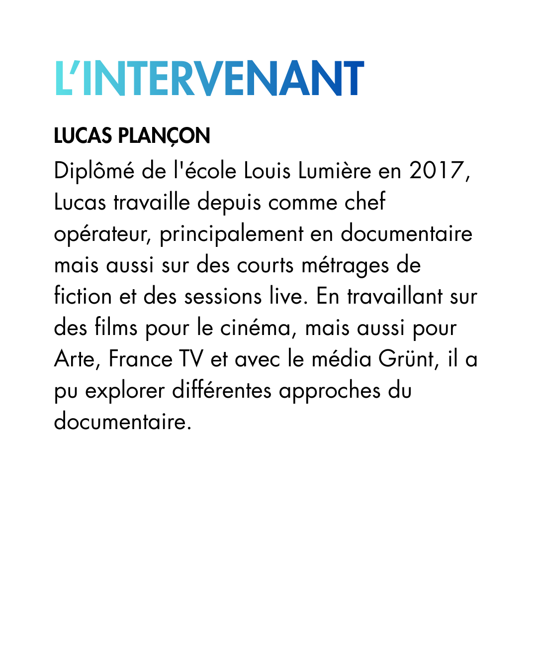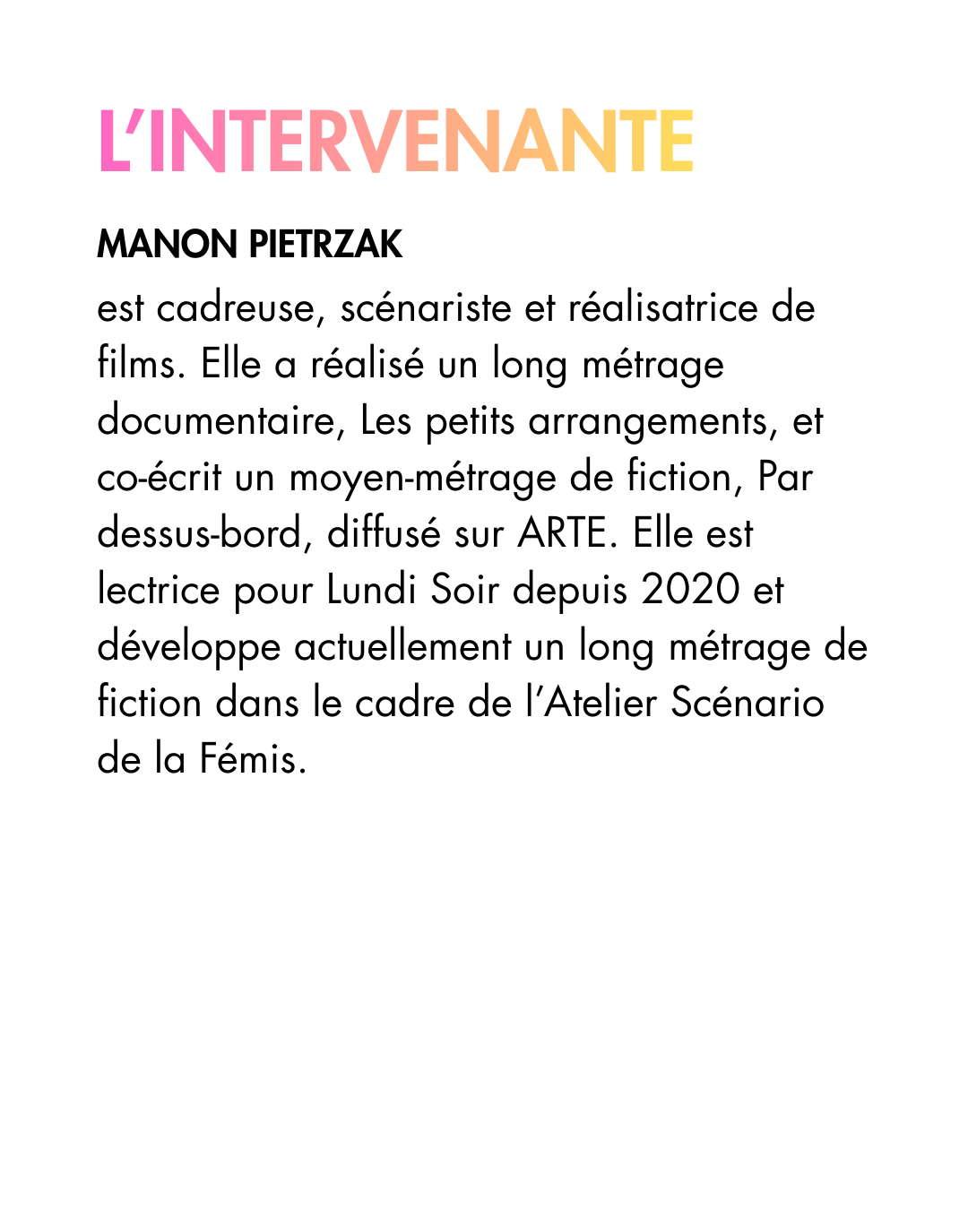 Des formations sur différents sujets en lien avec le documentaire, animés et proposés par les adhérent·es de l’association. Le programme de ces ateliers dépend des demandes et des propositions des membres de l’association.